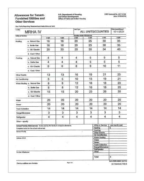 The 2024 SECTION 8 HOUSING CHOICE VOUCHER UTILITY ALLOWANCE EFFECTIVE OCTOBER 1, 2024